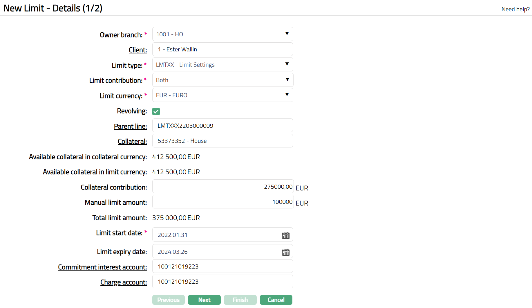 The non-editable fields include Owner Branch, Client, Limit type, Limit currency, Total collateral contribution and Total limit amount.