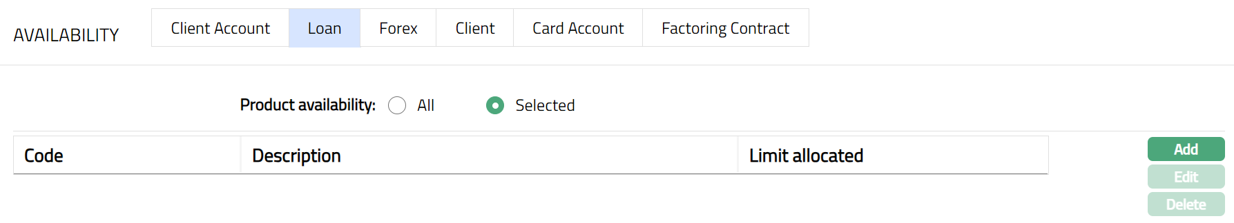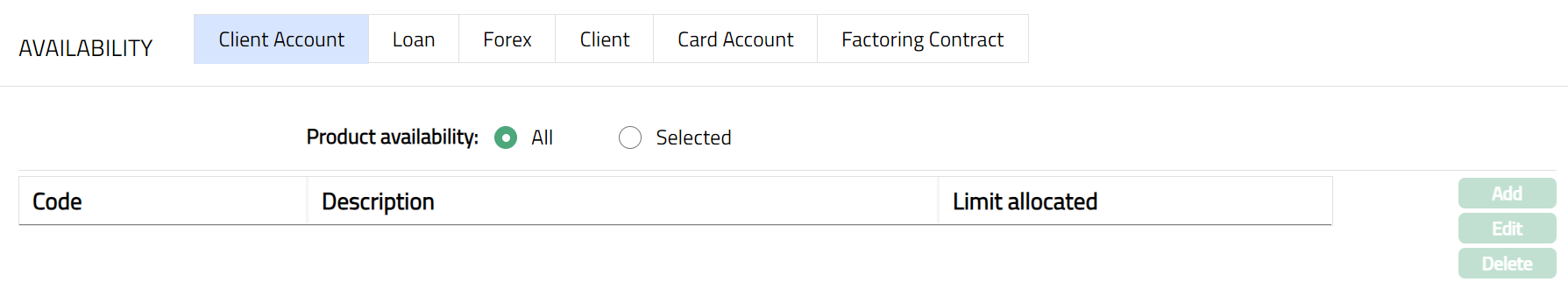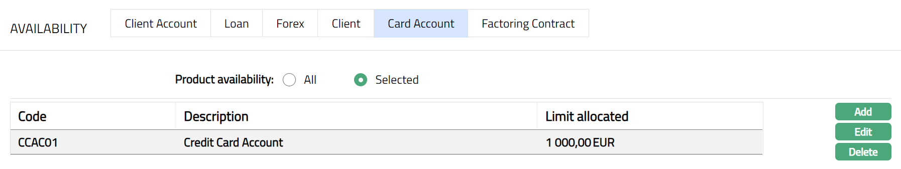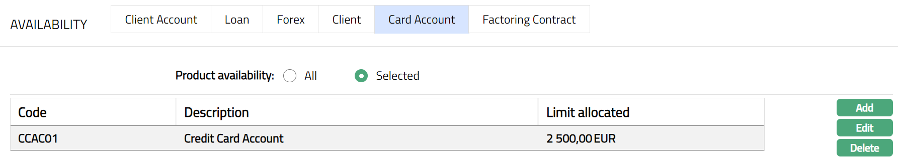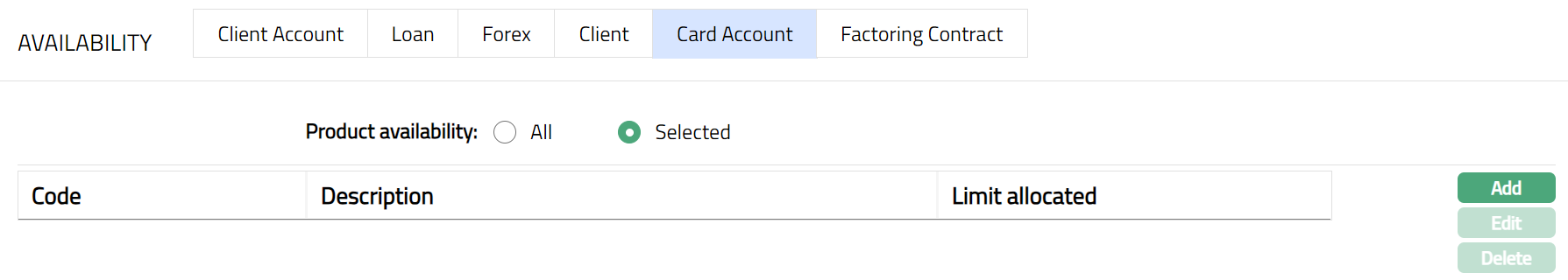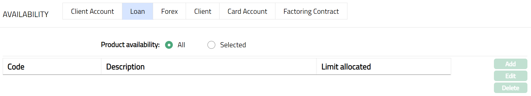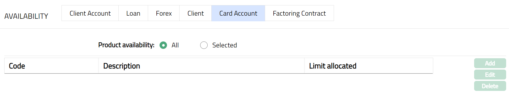 Using this tab, you can allow the Limit to be available for the, Loan, , Client, and Card Account. It has the following sub-tabs.