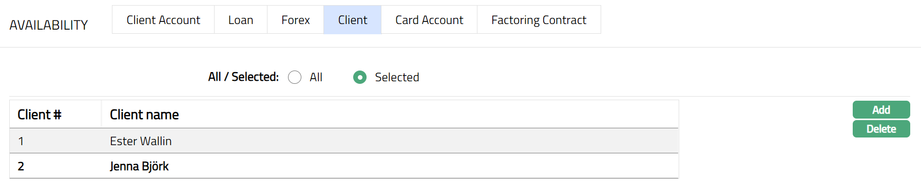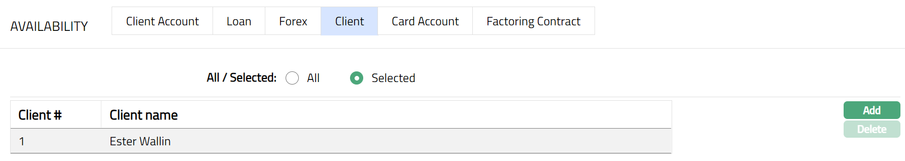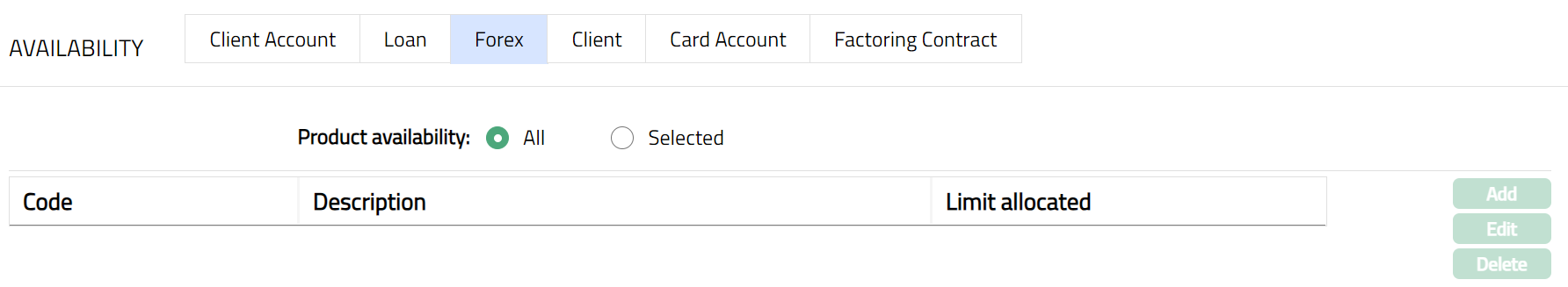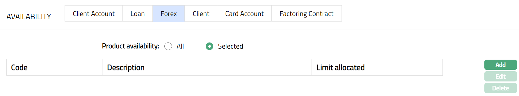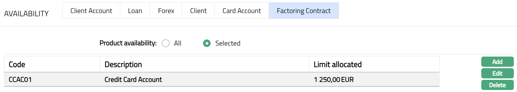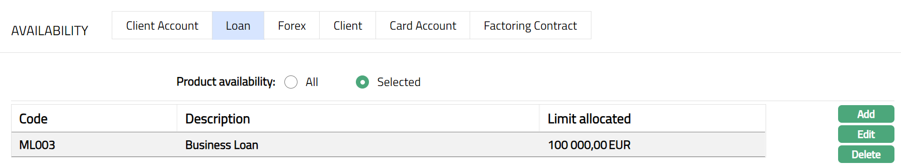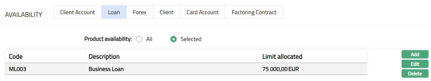 Using this tab, you can allow the Limit to be available for the, Loan, , Client, and Card Account. It has the following sub-tabs.