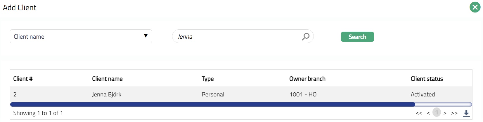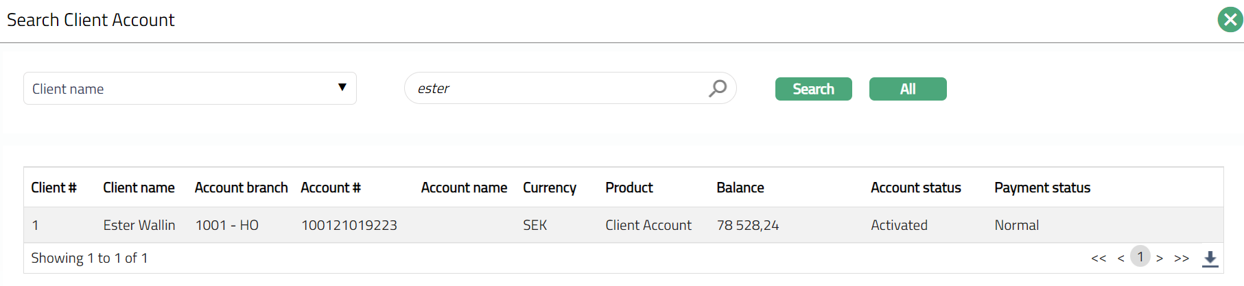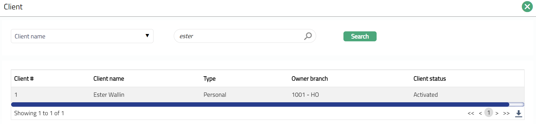 Select Client by clicking client hyperlink. Client search page appears where you can search for a client with relevant criteria and select the required client. You can also input the client's name and select the required client from the list displayed by Aura.
