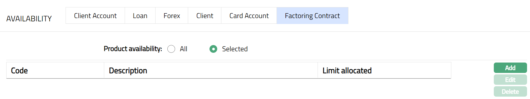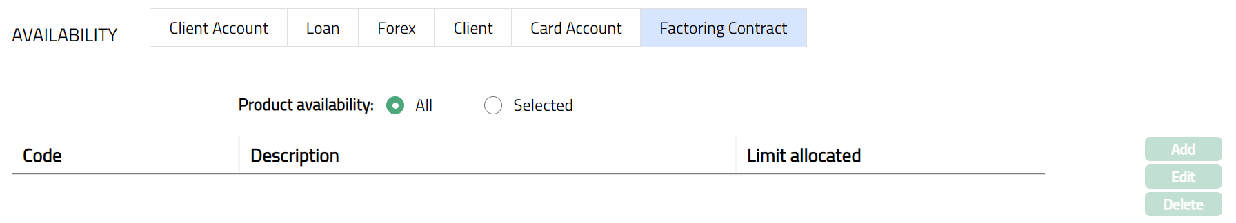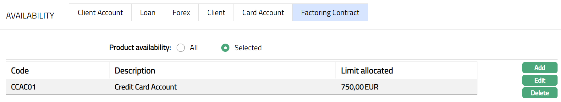 This tab shows all the Factoring contracts that are linked with the Limit.