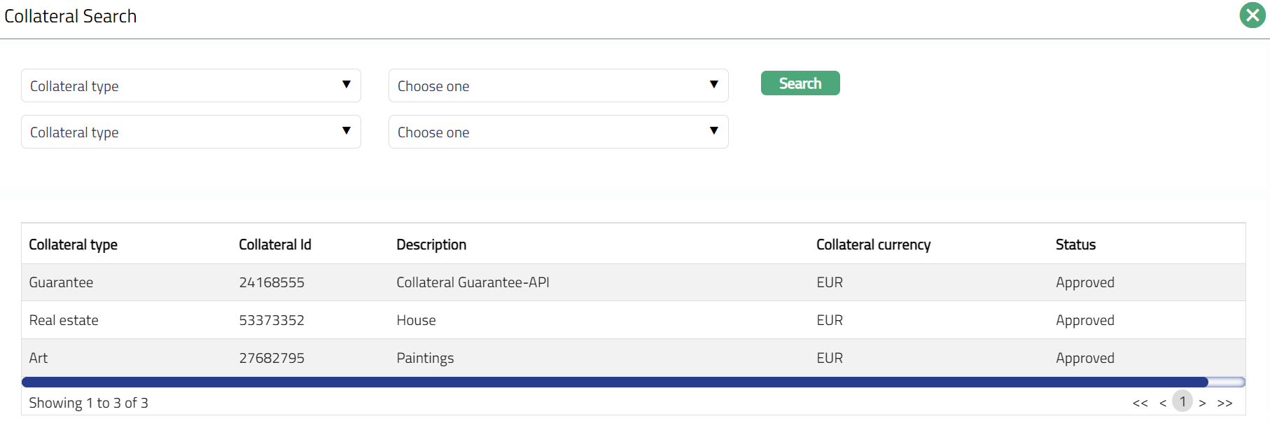 Click the hyperlinked Collateral ID and the Collateral Search page appears with the list of all the active Collaterals that are made available for the selected client. Select the appropriate Collateral to be added.