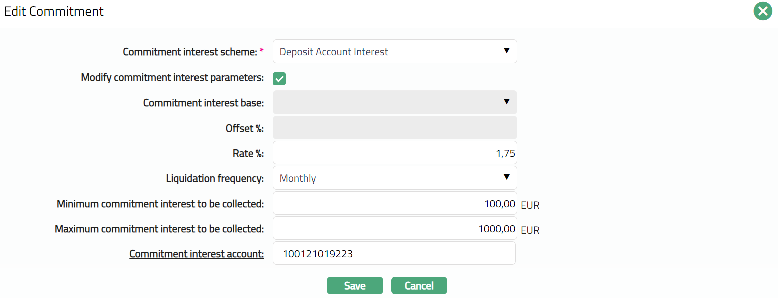 If the Limit Setting that you chose above has a commitment interest defined, you need to specify which account of the client will be used for debiting this commitment interest from in the Commitment interest account. You can either input the account number or use the hyperlink. If client owns a single account, then that account number will be displayed by default. If client has multiple accounts, click the hyperlink, the Search Client account page will appear displaying all the active current accounts held by the client. Select the required account.