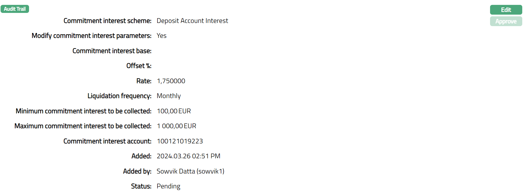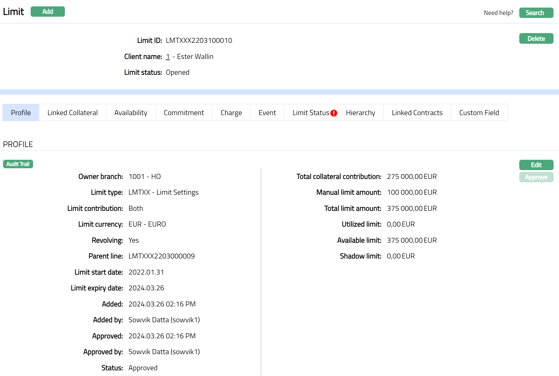 The created limit will be linked with the contracts or accounts and all the linked contracts information will be available at the limit definition level. Aura will allow you to edit the limit which is created but deletion will not be allowed once the limit is activated and approved.