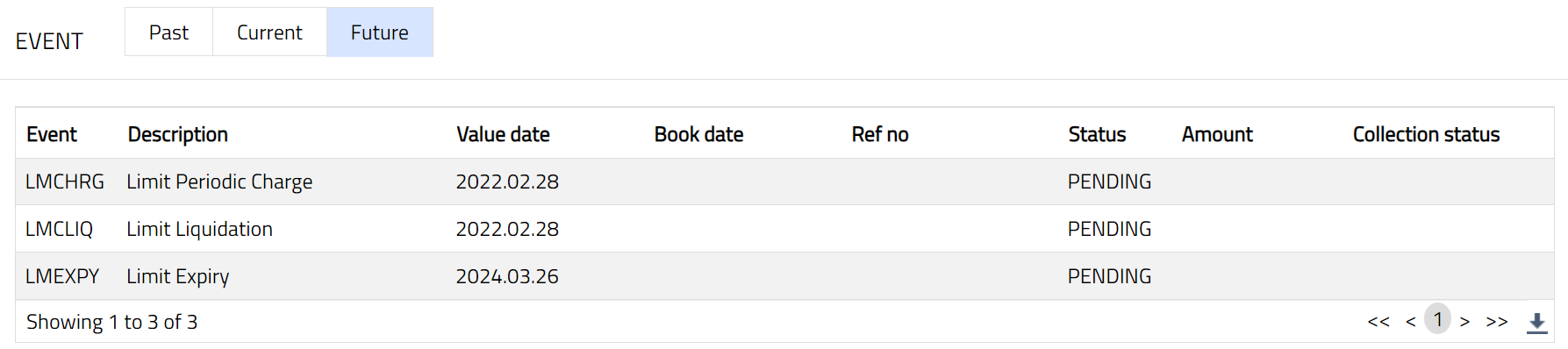 | LMCLIQ | Limit Liquidation | This event gets triggered during the End of the Day process. The interest for the limit gets liquidated and accounting entries get posted. |