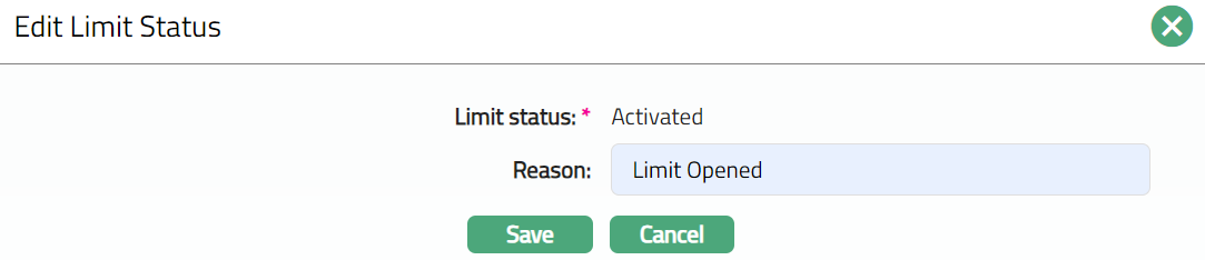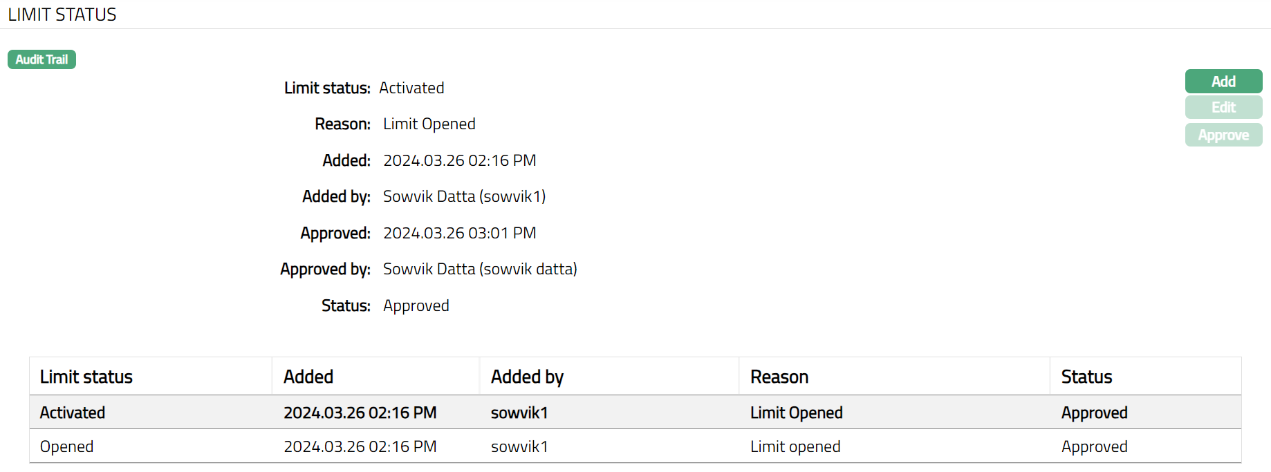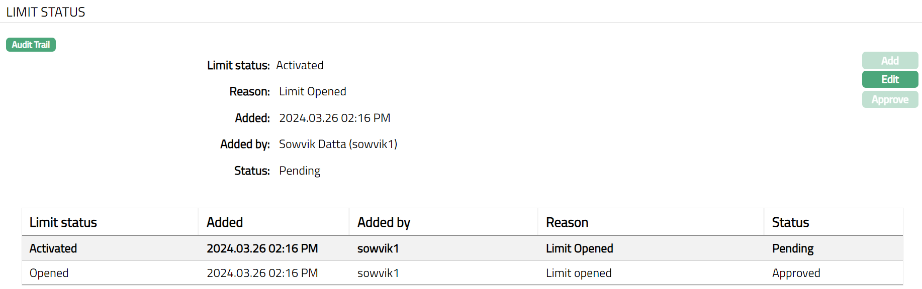 Limit Status displays the status of the limit. The status of a Limit can be Opened, Activated, Suspended and Expired. As soon as the limit is created, by default the Limit status will be Opened and Activated, status of the record will be Approved and Pending. The blue bubble will appear on the tab. If you click on Opened status, Add, Edit, Approve button will be disabled and if you click on Activate status, Edit button will be enabled and Add, Approve button will be disabled. On approval, the Limit status gets changed to Activated and Approved, Add button will get enabled and Edit and Approve button will be in disabled status.