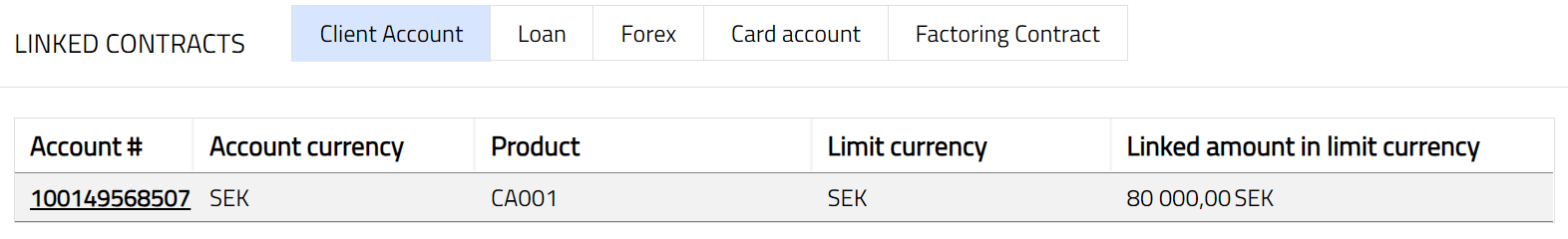Linked amount in limit currency displays the amount of the limit linked to the current account, in terms of the limit currency.