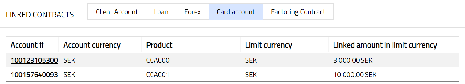 Linked amount in limit currency displays the amount of the limit linked to the card account, in terms of the limit currency.