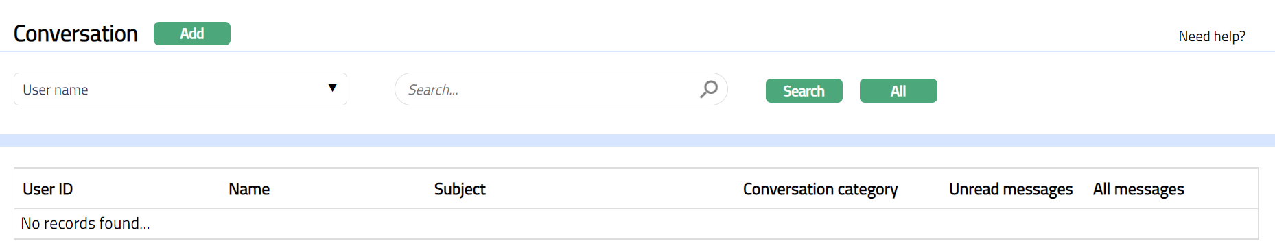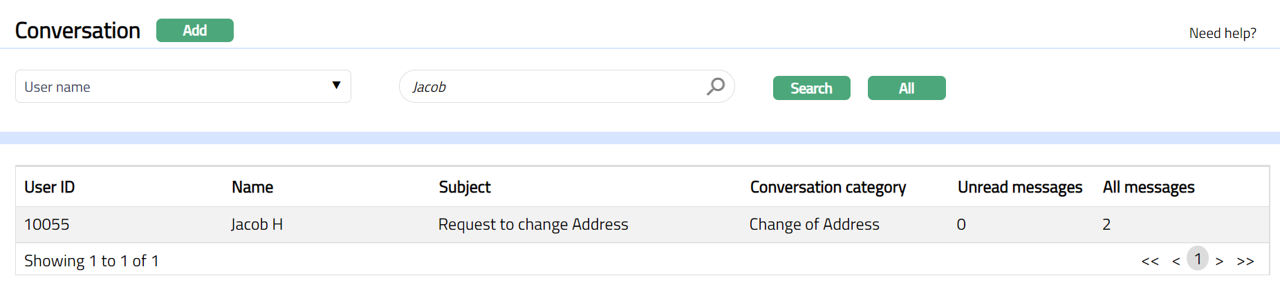 - From CRM menu, Click Conversations and then click conversation. Conversation search page appears displaying the conversation maintained as shown below.