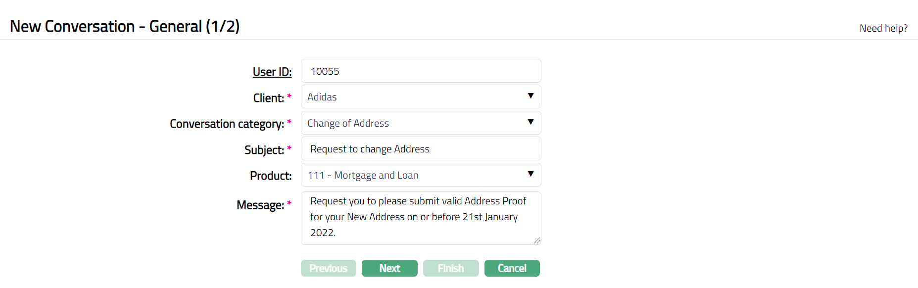 Select Conversation category from the available drop-down list maintained under Admin > System Codes > Categories > Conversation Category. This field indicates the category of the message.