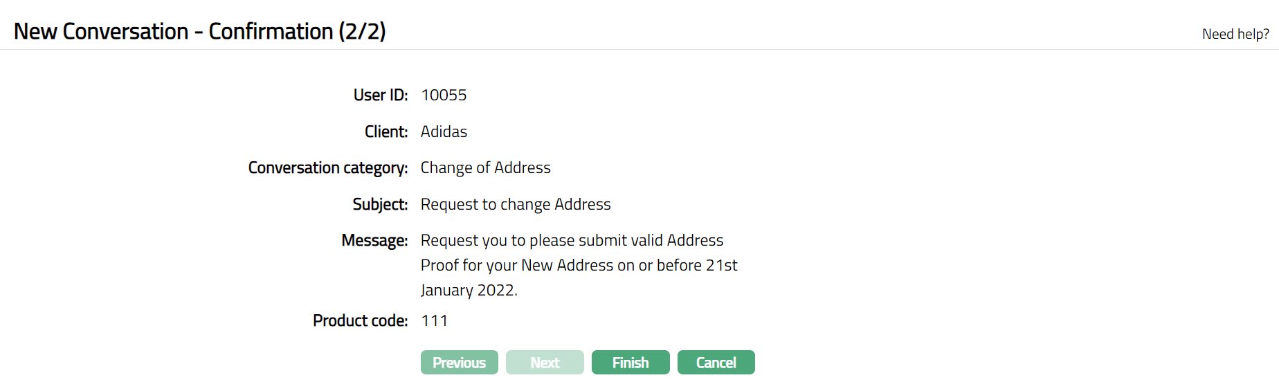 Click Next. New Conversation -- Confirmation (2/2) page appears.