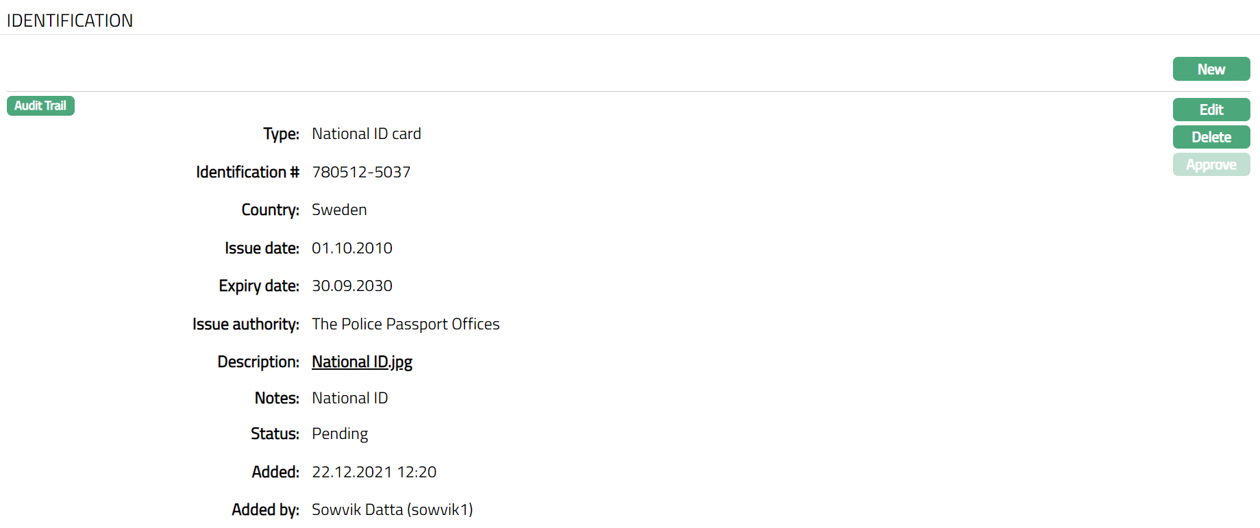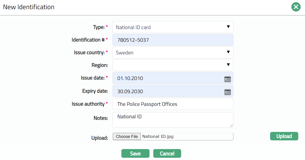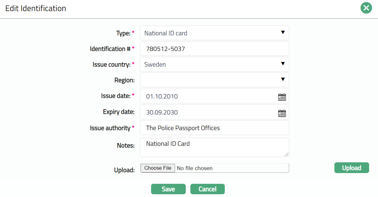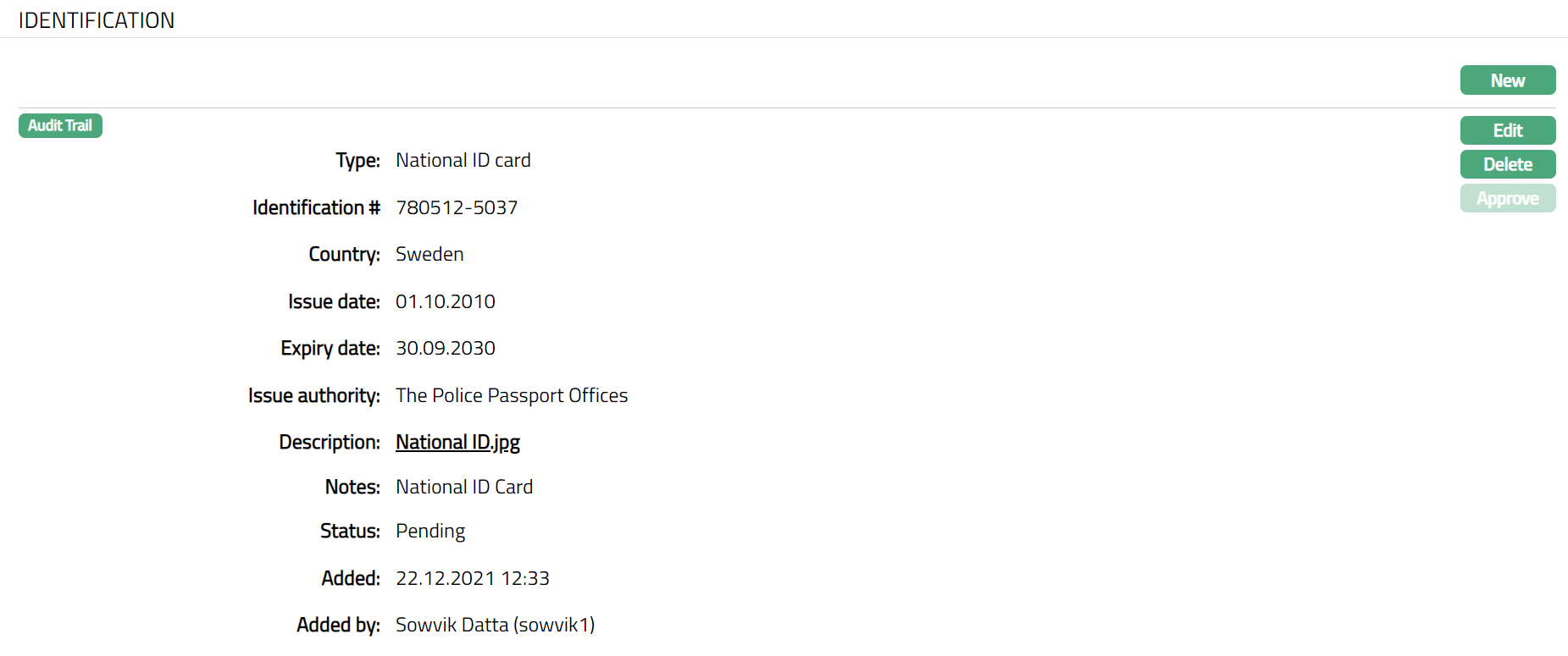 - Make required changes and click Save. Identification tab appears with the edited details.