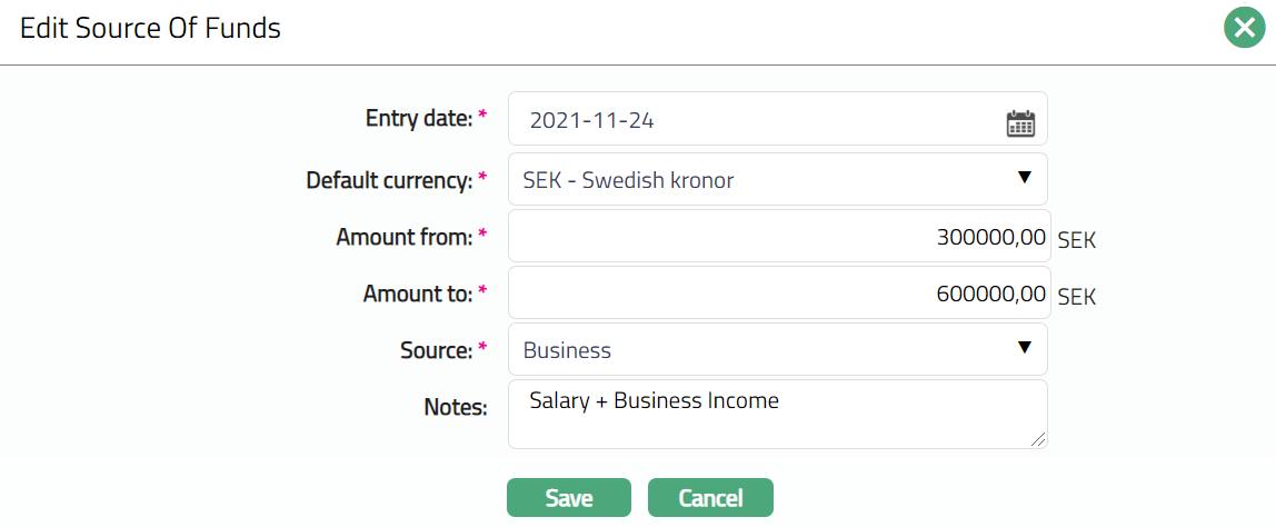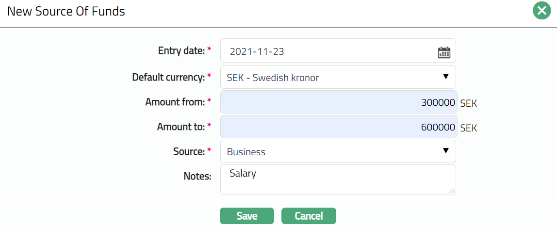Source of Funds tab allows you to create and maintain the source of funds details. It refers to where an organisation got hold of or received the funds being deposited