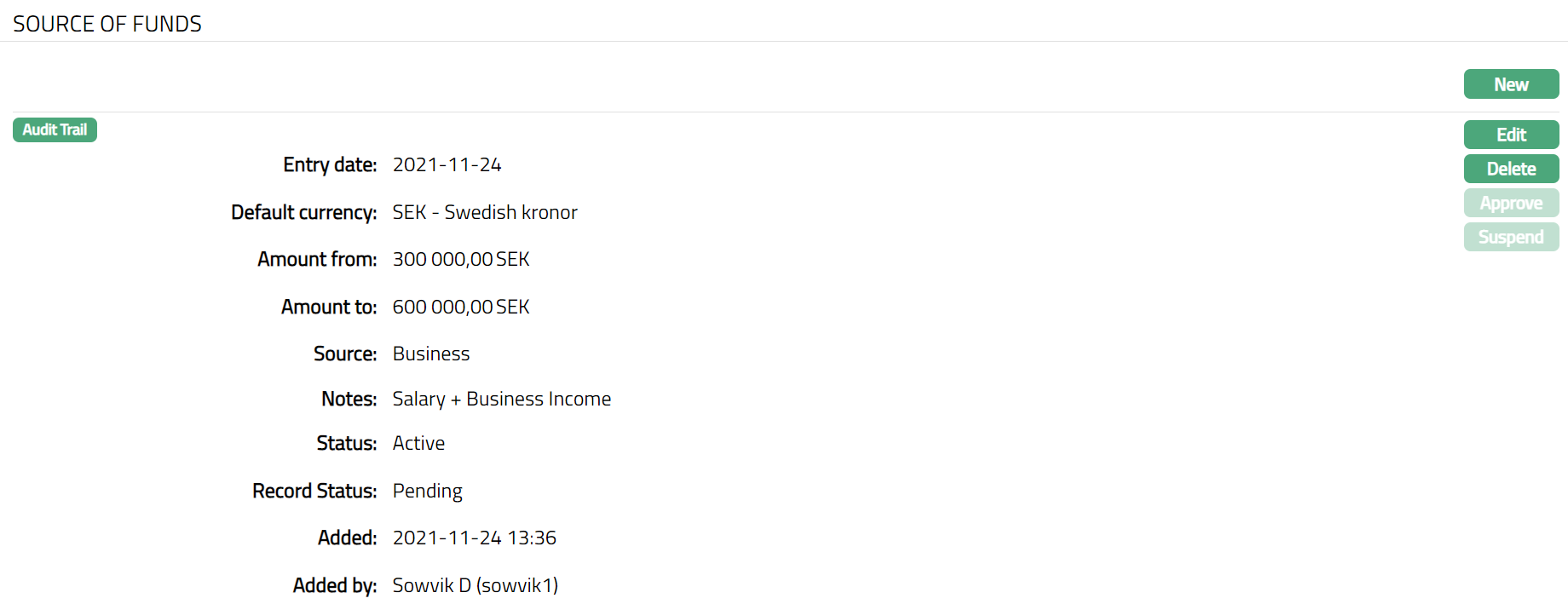 Suspend: You can suspend a Source of Fund record by clicking on Suspend button. When you click on Suspend button, Aura will ask for confirmation. On confirmation, Aura will suspend the Source of Fund record. Suspended records can be activated by using Activate button.