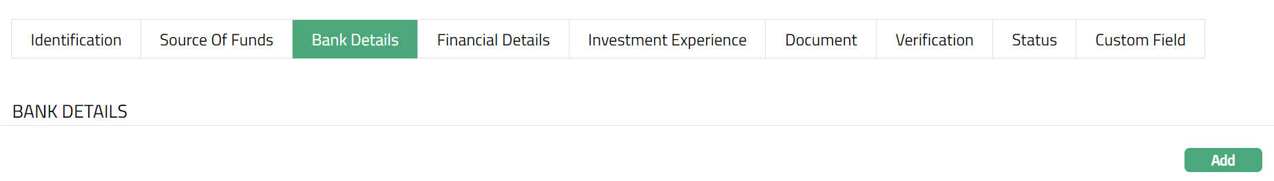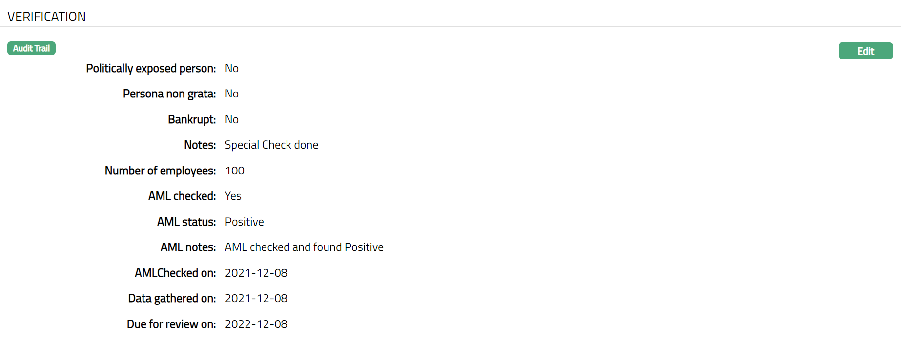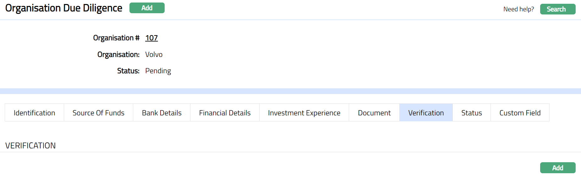 Verification tab allows you to verify the activities of the organisation like whether the organisation is politically exposed and whether the AML check is required for the organisation.