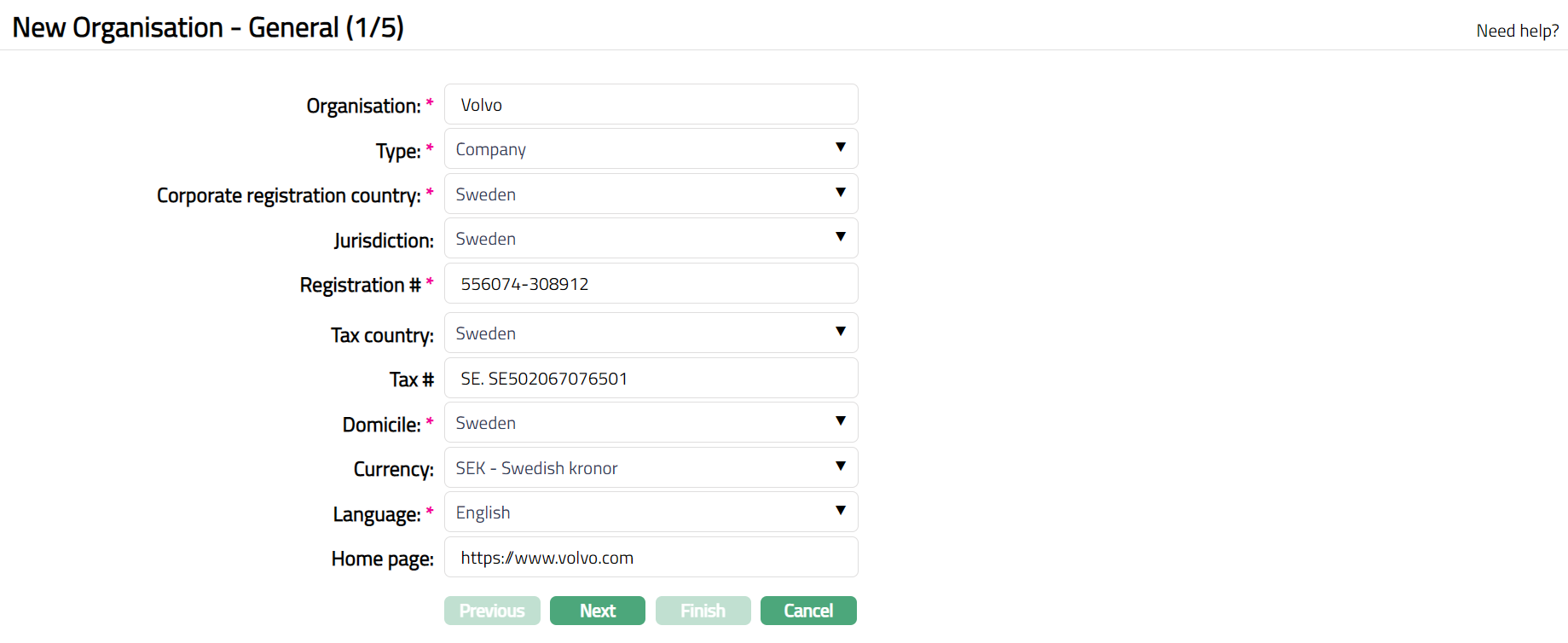 - Click Add. New Organisation -- General (1/5) page appears