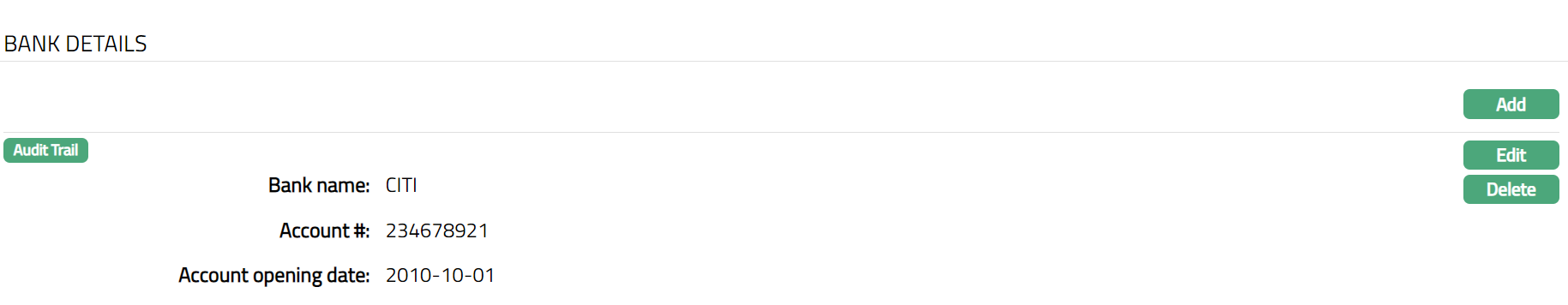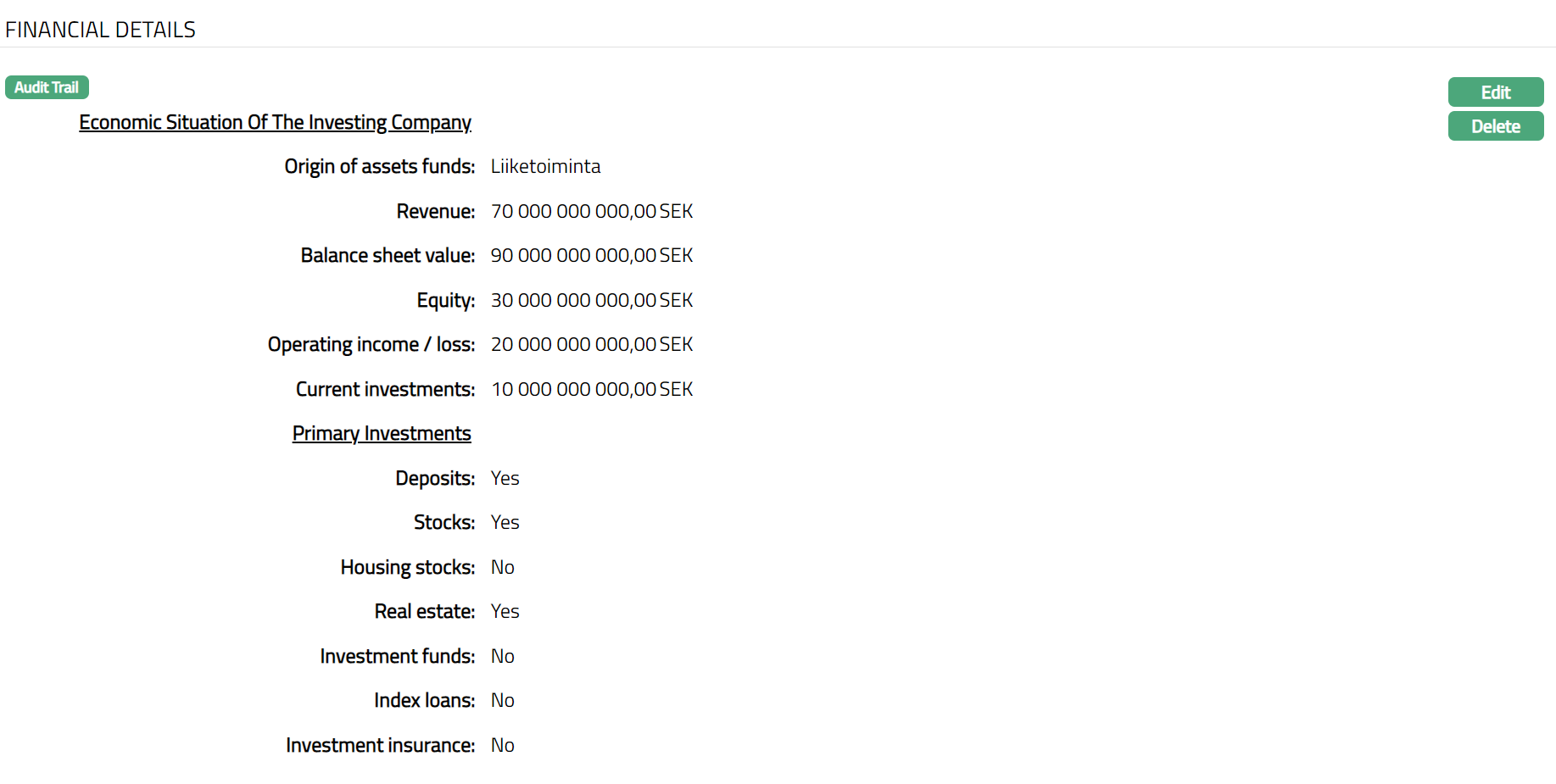 Delete: You can delete the Financial Details record saved in Aura by a click on Delete button. Aura will ask for confirmation, on approving which the selected record will be deleted.