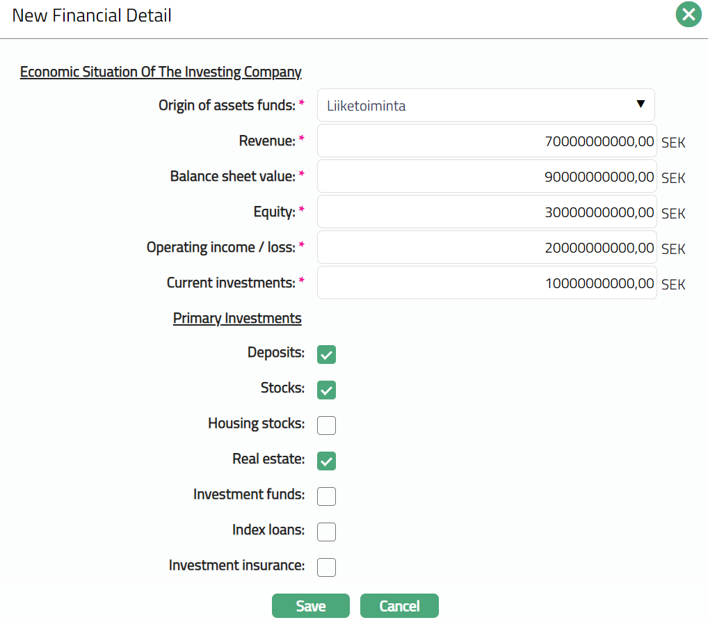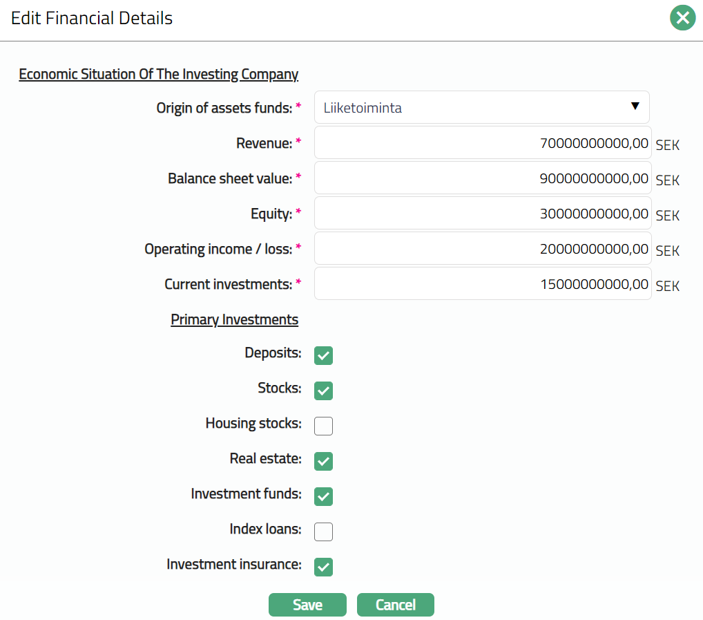 - Make required changes and click Save. Financial Details tab appears with the edited details.