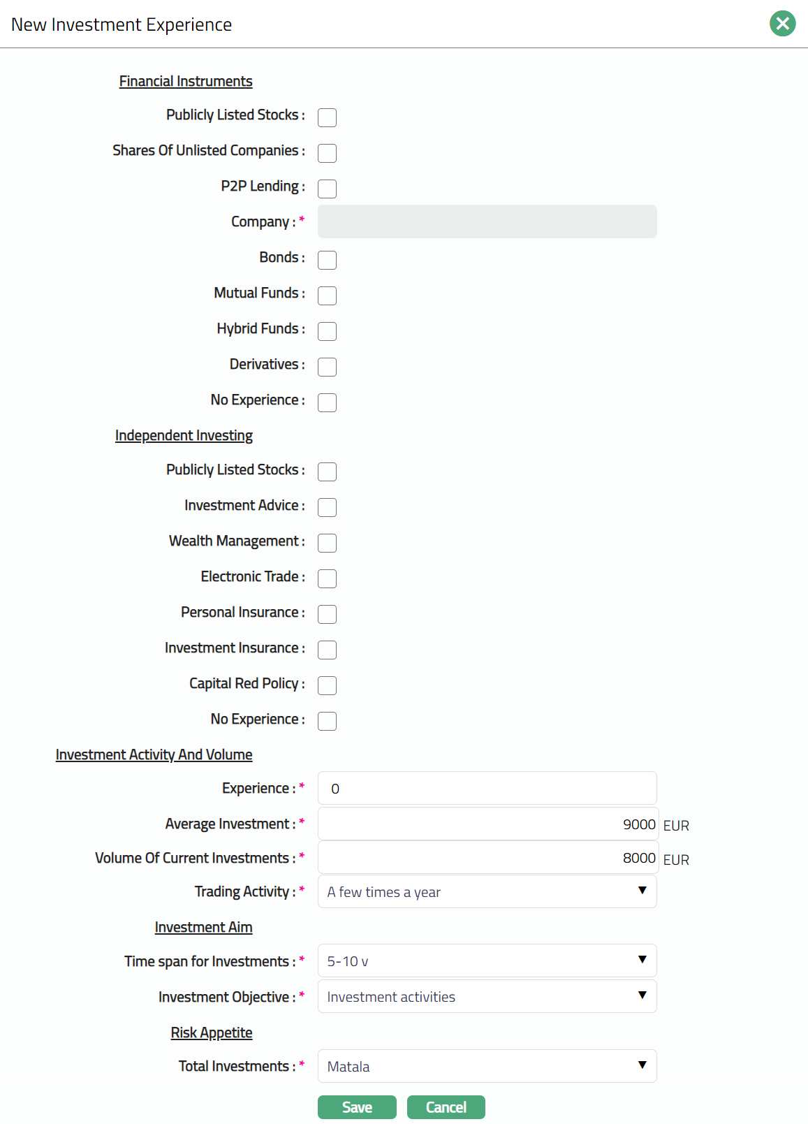 Investment Experience tab allows you to define the accumulation of investment knowledge or skill that results from direct participation in market events or investment activities. You need to select the relevant investment parameters against each Investment type.
