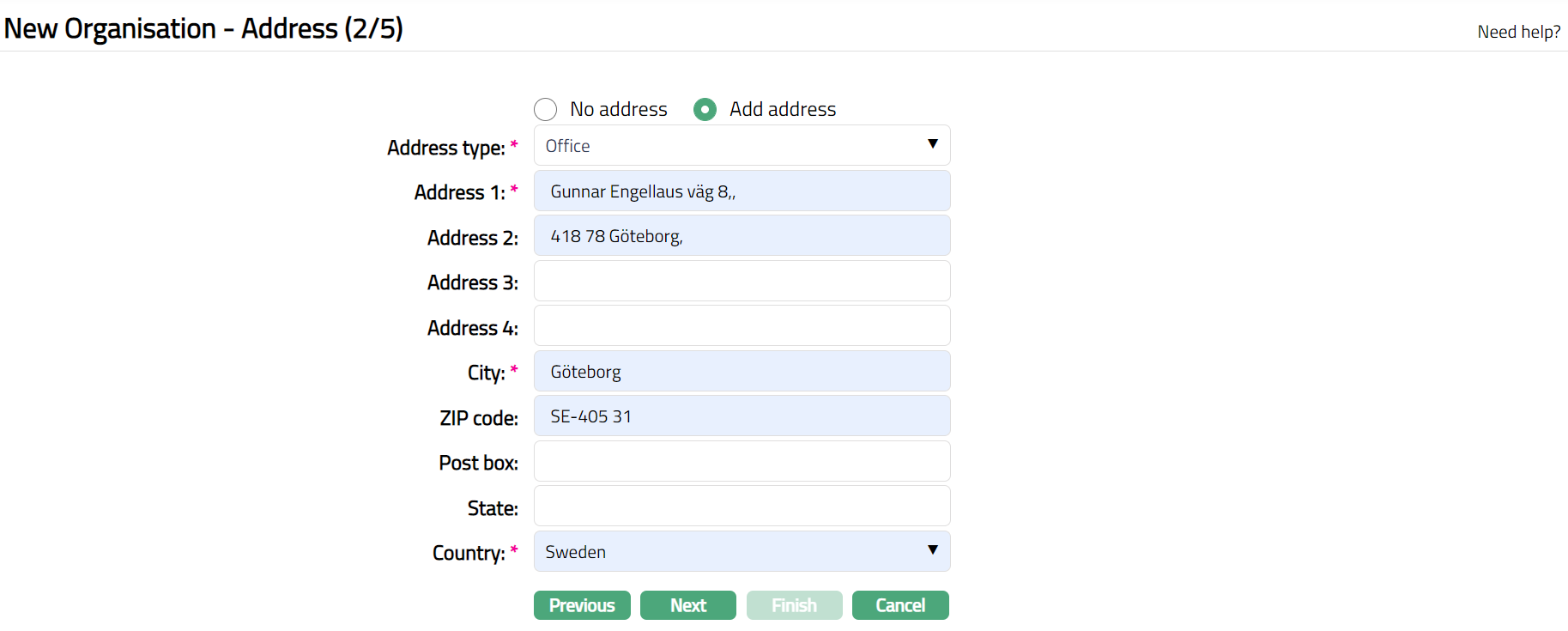 Click Next. New Organisation - Address (2/5) page appears.