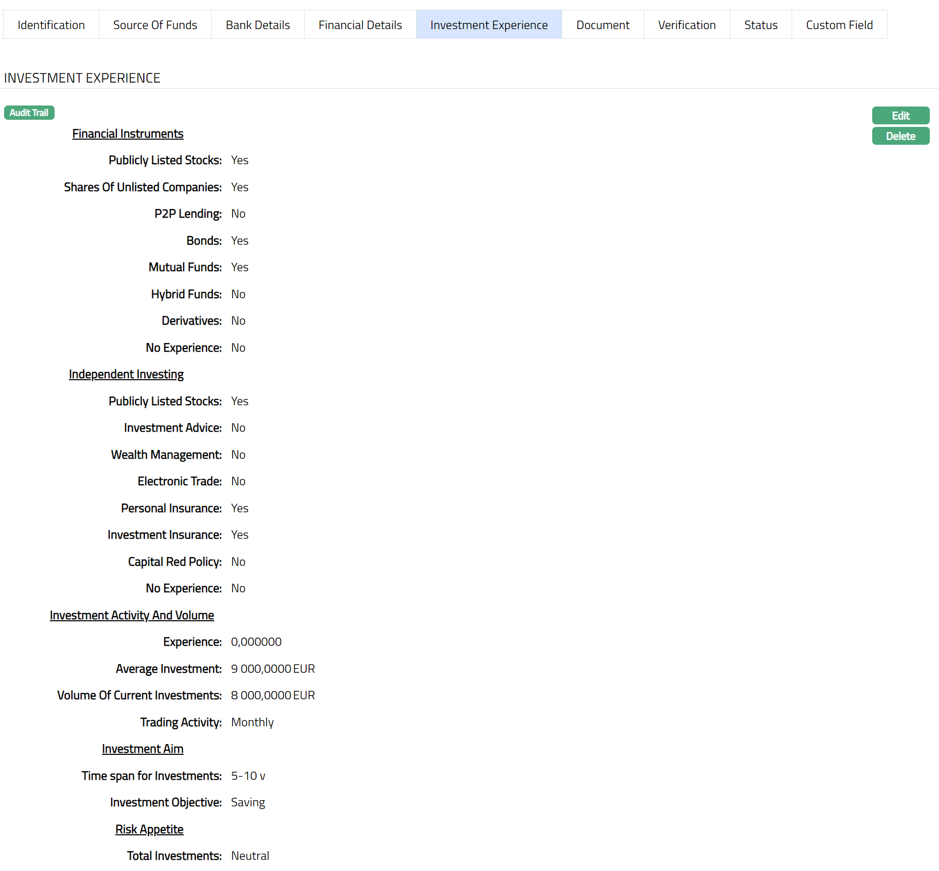 Delete: You can delete the Investment Experience record saved in Aura by a click on Delete button. Aura will ask for confirmation, on approving which the selected record will be deleted.