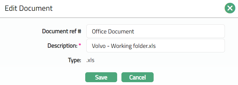 Select Type of the Document uploaded from the list of Document Types maintained under Admin > Documents > Document type. Once entered, this cannot be edited.