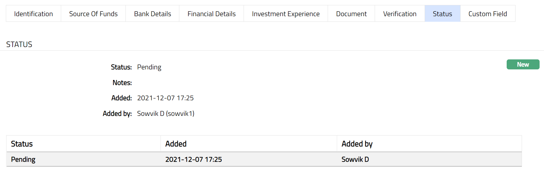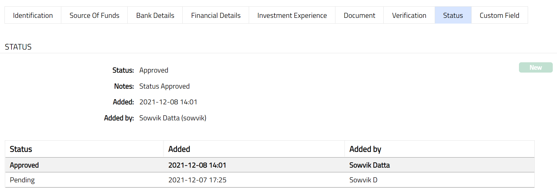 Note: On addition of a new record / edit, the tab Status appears as pending. Only on Approval by authorized person, the Status becomes Approved