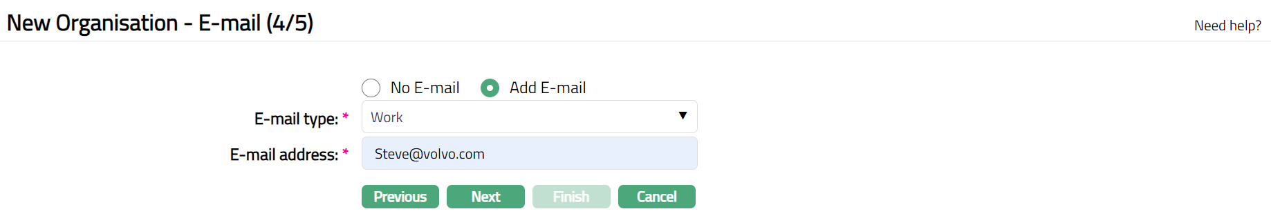 By default, No E-mail is selected. If you do not want to enter the E-mail details of the organisation at this stage, then you can select this option.