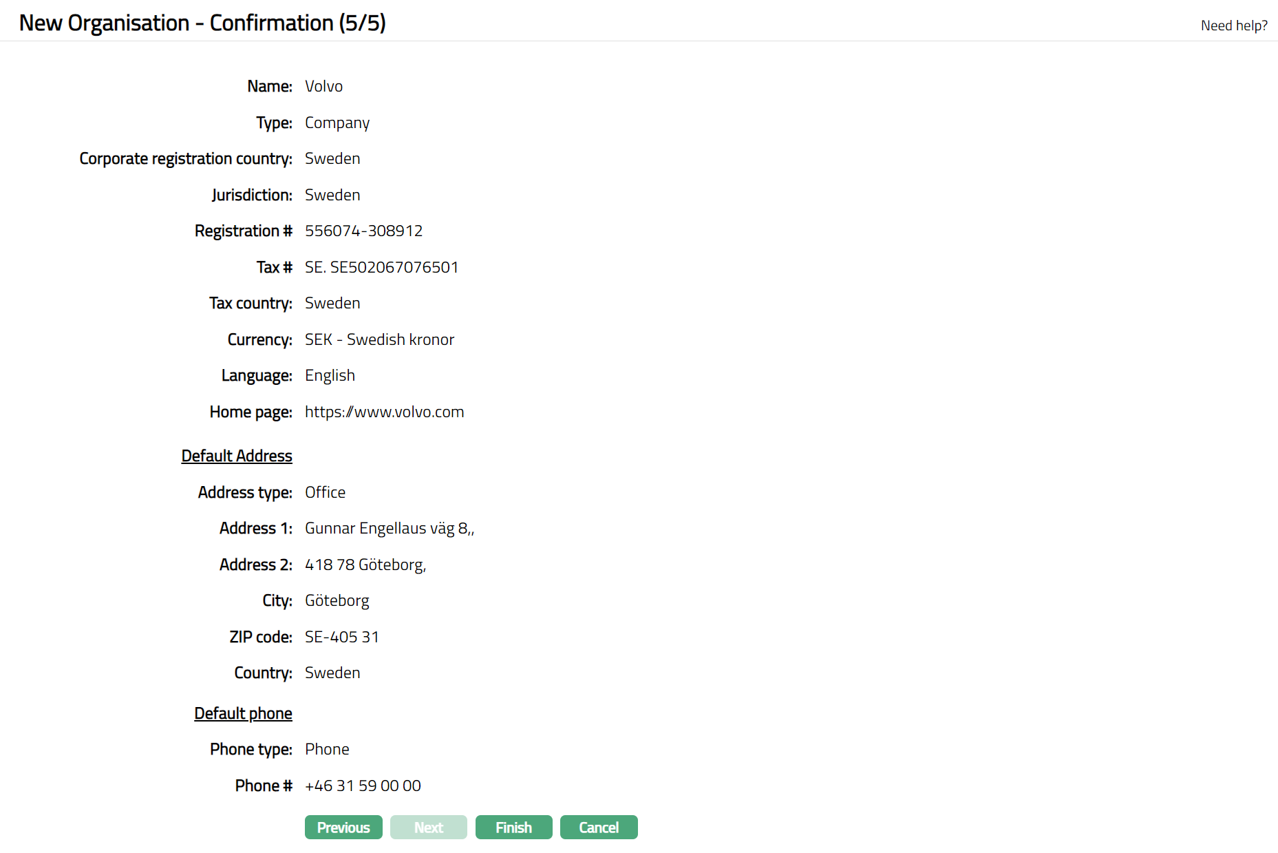 Click Next. New Organisation -- Confirmation (5/5) page appears.