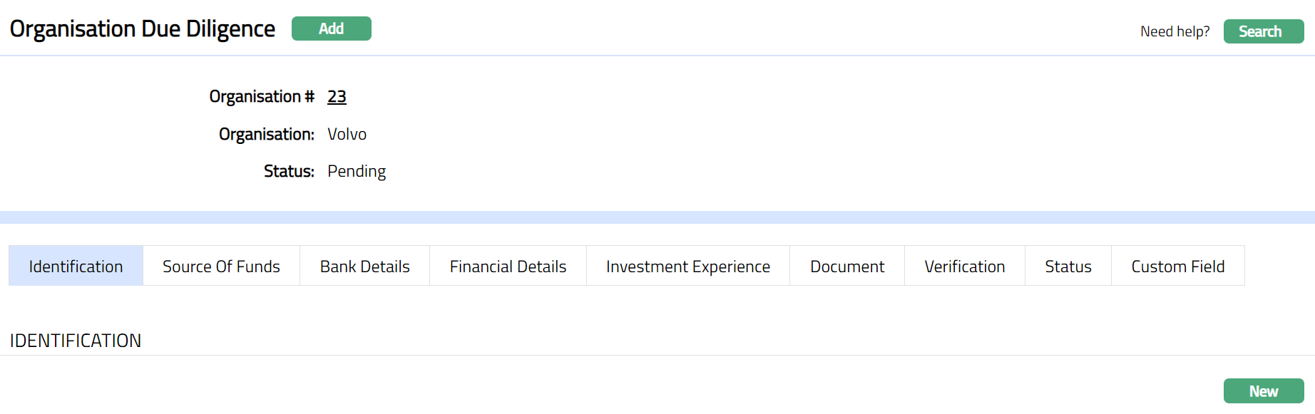 - Click Finish. Organisation details are added with a unique Organisation # and you will see the Organisation Due Diligence window displaying the Identification Tab by default. Due Diligence Status will be Pending.