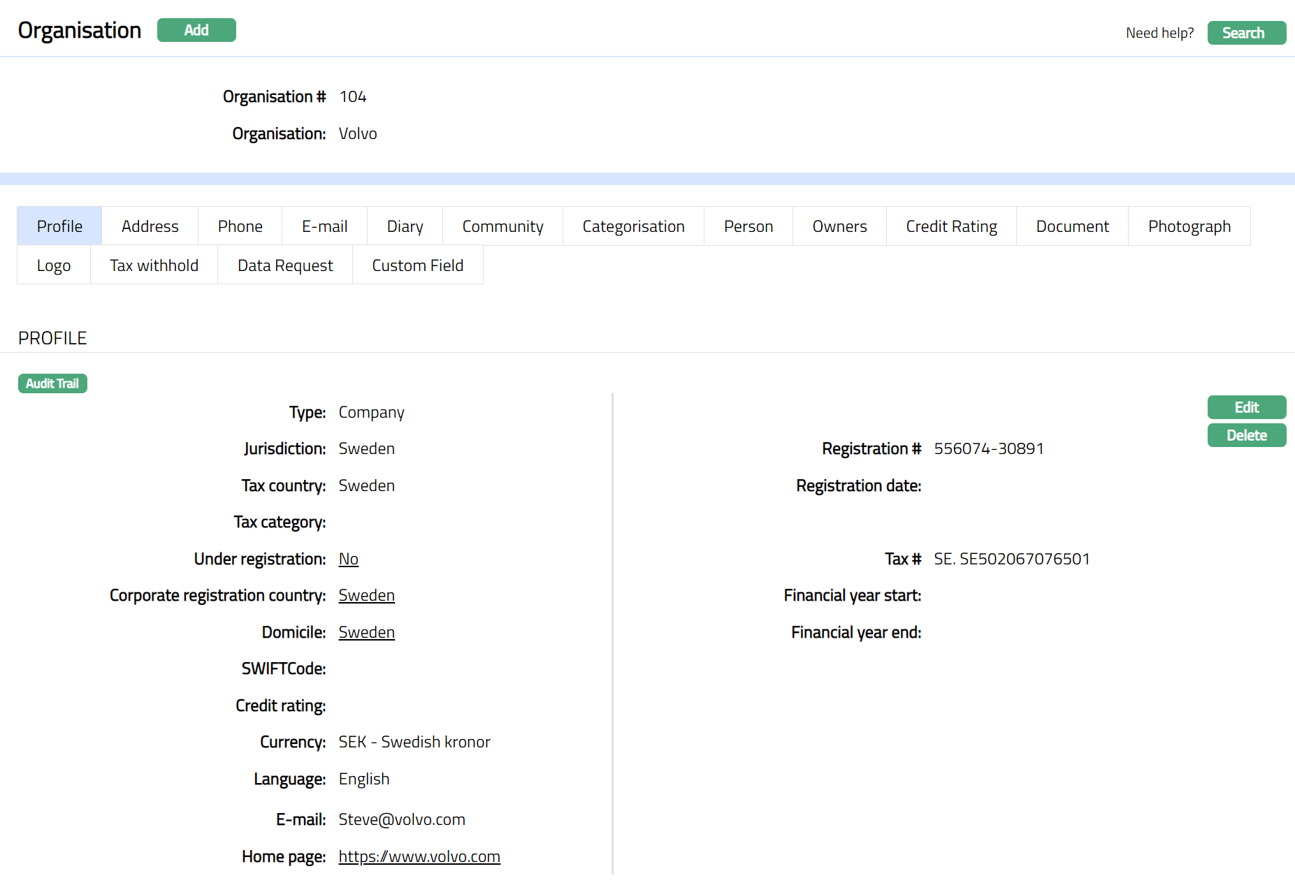 - Click Finish. Organisation page appears with the added details with a unique Organisation #. Note: Profile tab will be displayed by default.