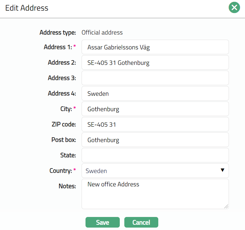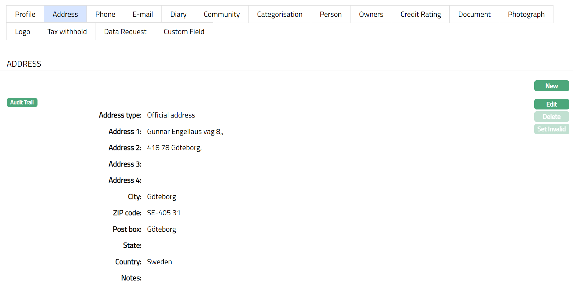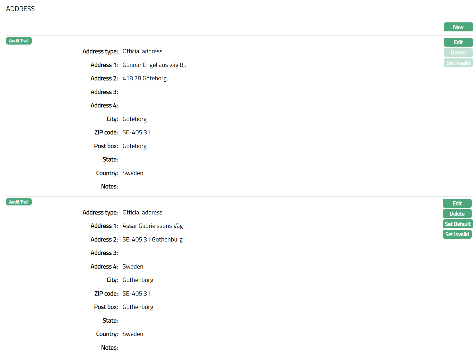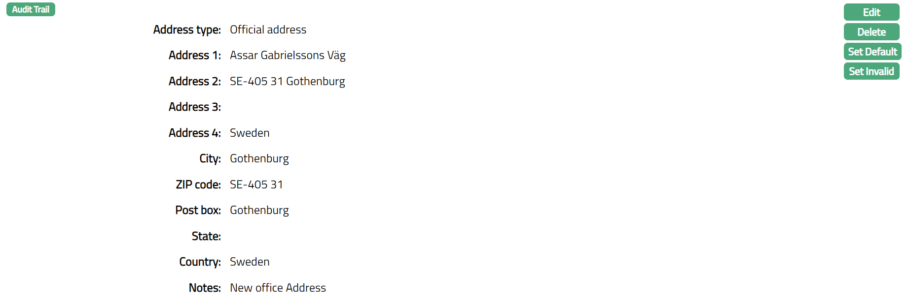 Set Invalid: You can set an Address as invalid by a click on Set Invalid. This means that the particular address record is no longer valid. Aura will ask for confirmation. On confirmation, the Address is made invalid and Set Valid button appears in place of Set Invalid button.
