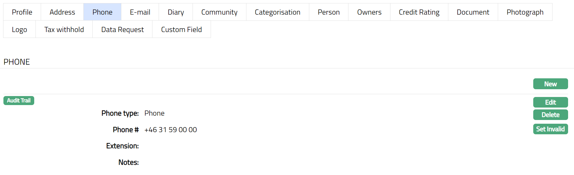 - Click New if you wish to Add new phone details for the Organisation. New Phone page appears.