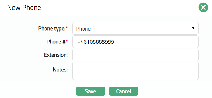 Select Phone type from the available drop-down list maintained under Admin > System codes > Address details > Phone types.