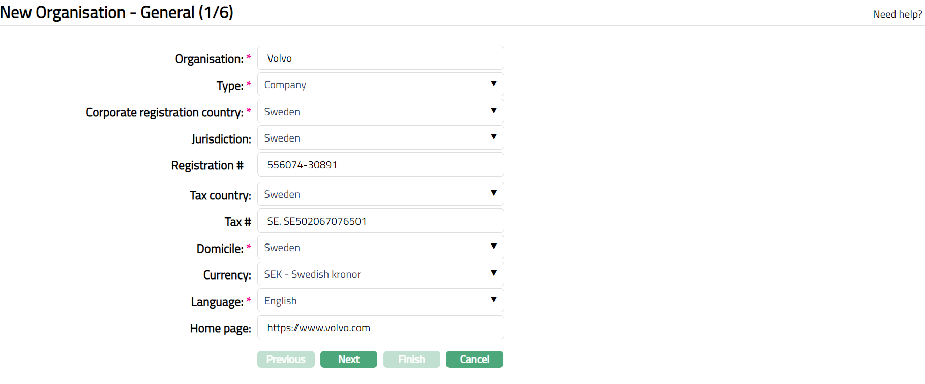 Select Domicile of the Organisation from the available drop-down list of the countries maintained under Admin > System codes > Generic definitions > Countries.