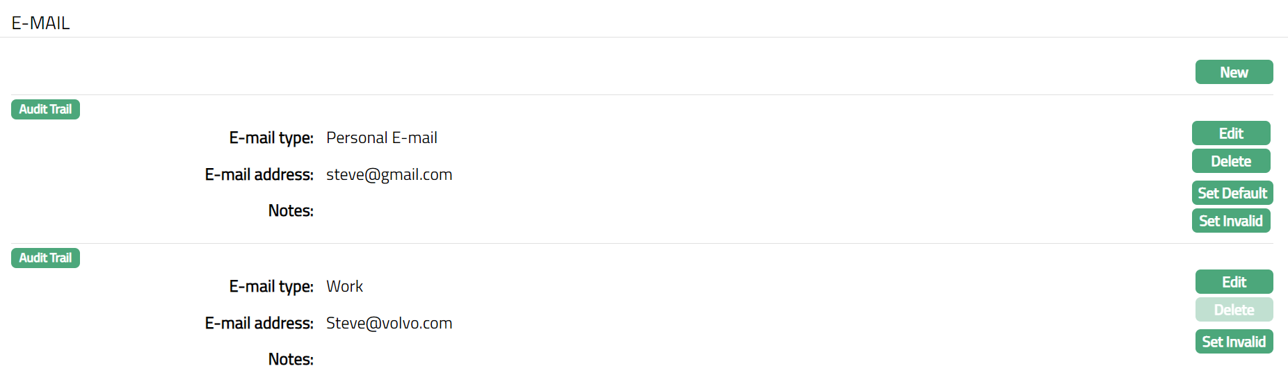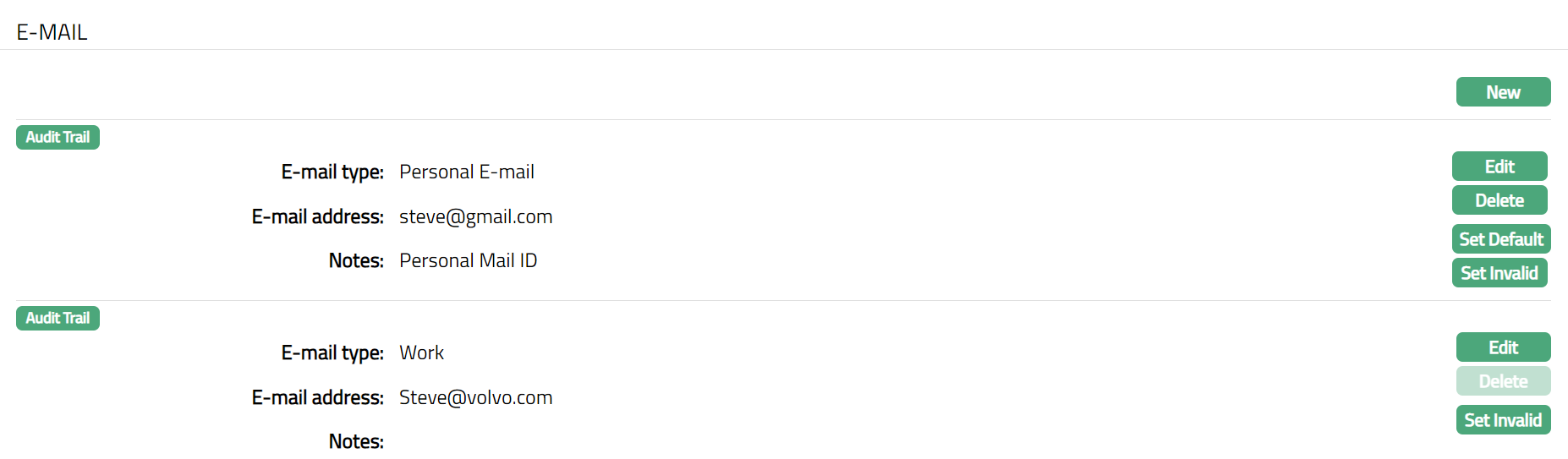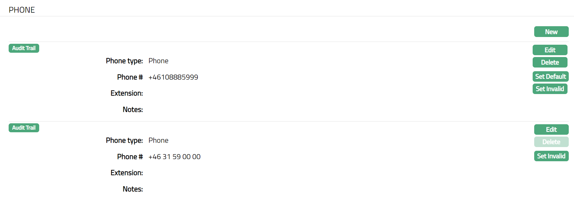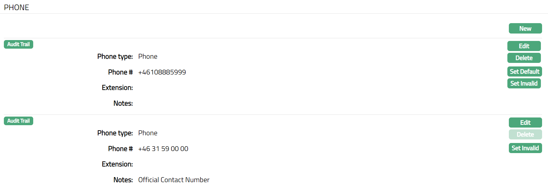 Set Default: When you create multiple Phone records, you can set one of them as the default Address using the Set Default function. When there is only one Phone detail, the same is taken as the default Phone.