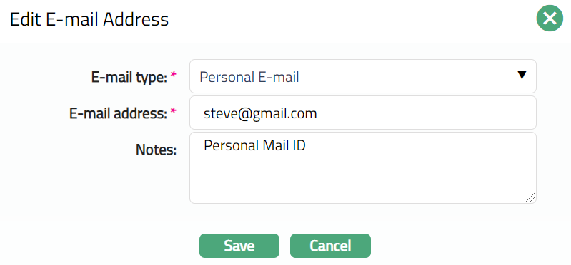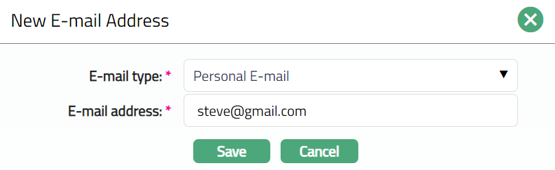 Select E-mail type from the drop-down list of email types maintained under Admin > System Codes > Address details > E-mail types.