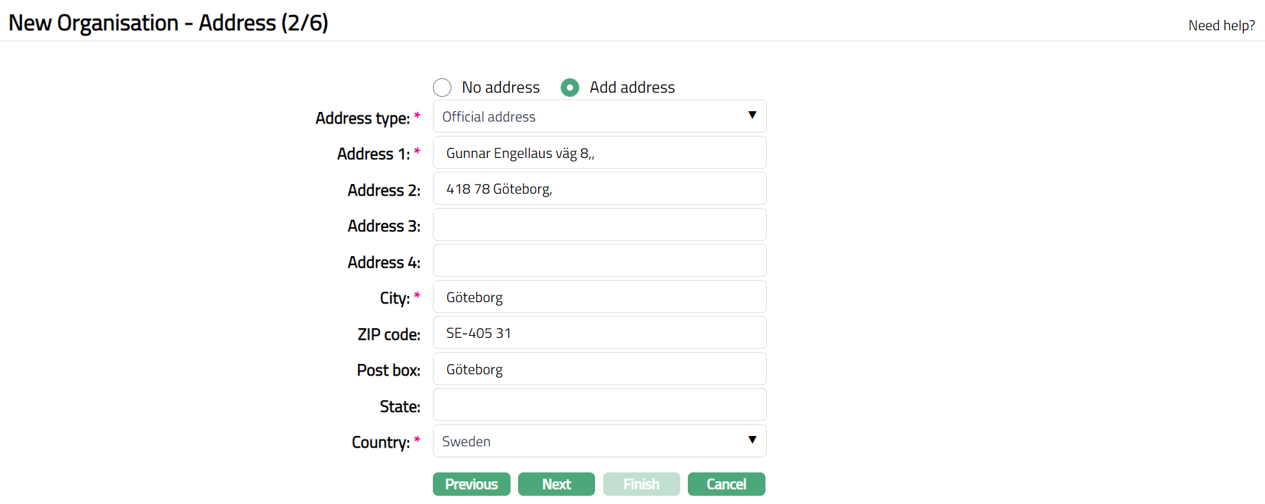 Please refer to New Organisation -- Address (2/6) for the details regarding the fields.