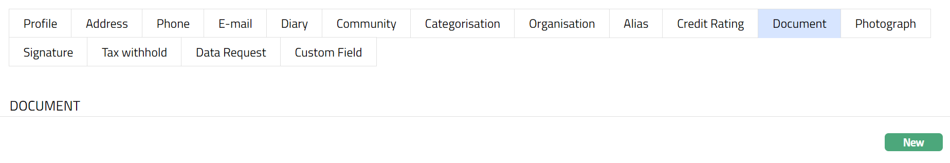 Document tab allows you to upload documents related to the person. These can be in the form of scanned images or files on your computer. You can categorise the documents as per Document Type and store with a document reference number.