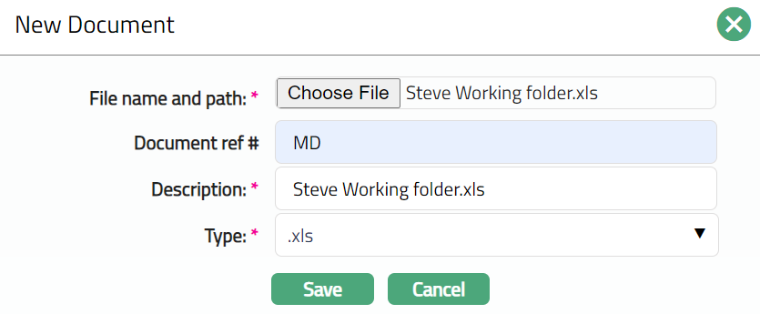 Select Type of the Document uploaded from the available drop-down list maintained under Admin > System Codes > Documents > Document types. Once entered, this cannot be edited.