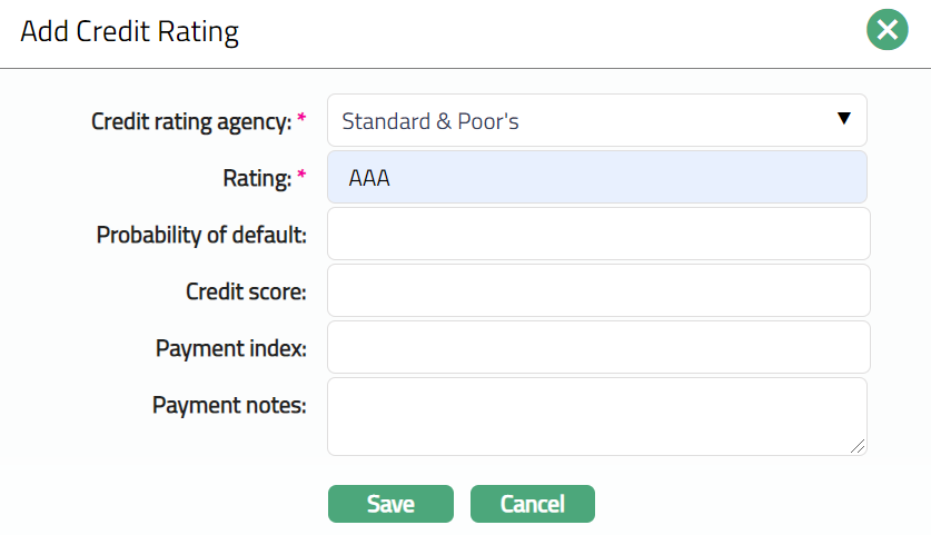 - Select Credit Rating agency of the organisation from the available drop-down list of Credit rating agencies maintained under Admin > System codes > Generic definitions > Credit rating agency. Once saved, this field cannot be edited.