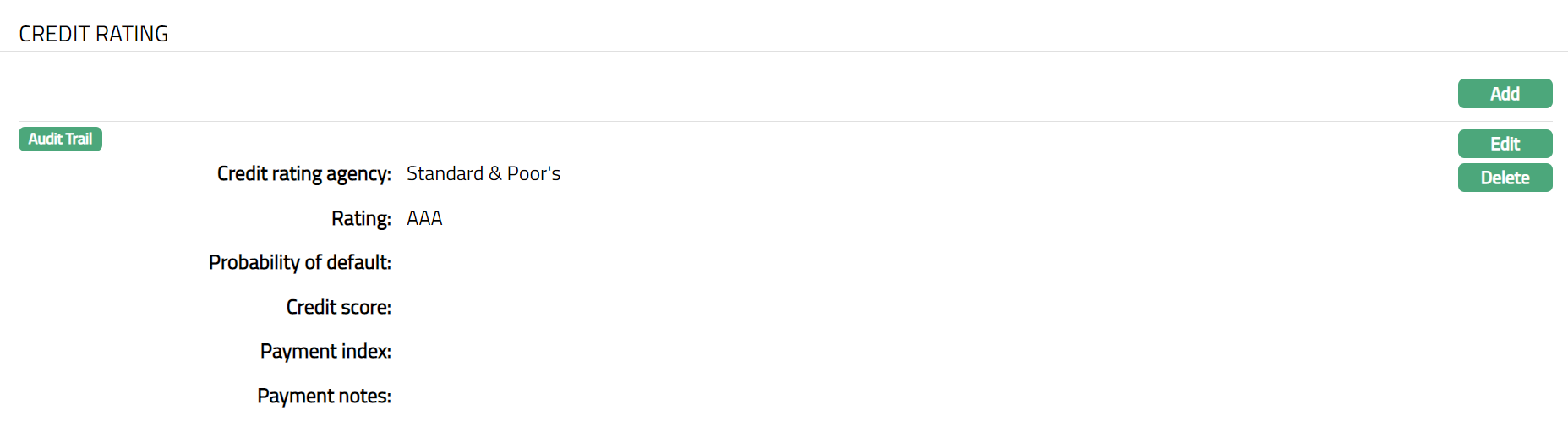 Credit Rating is the Credit worthiness of an organisation. Credit Rating happens externally from Aura. Aura has ability to provide or accept data from external systems through APIs. Hence Aura can connect with any Credit Rating agency and collate the data.