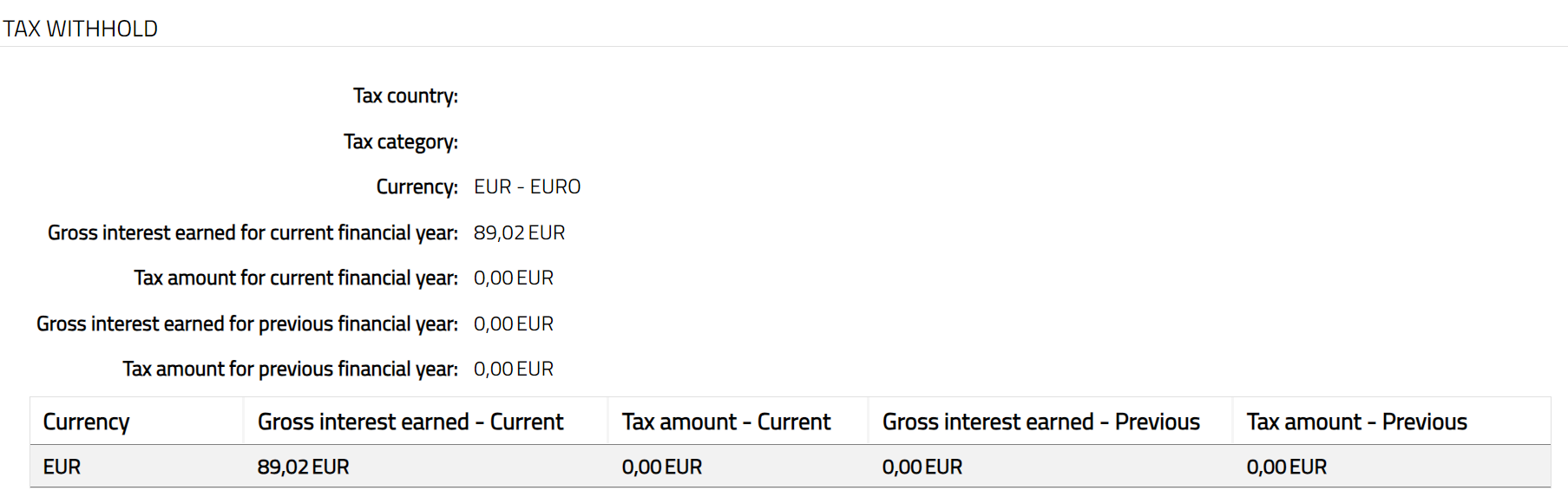 Tax Withhold tab is used to store details related to the amount of tax which must be withheld on interest on deposits according to the tax laws of that Country. Here views the gross interest earned and tax amount per currency for current and previous financial years (based on current booking date) currency wise. This will also show you the Tax Country and Tax Category of the Organisation.