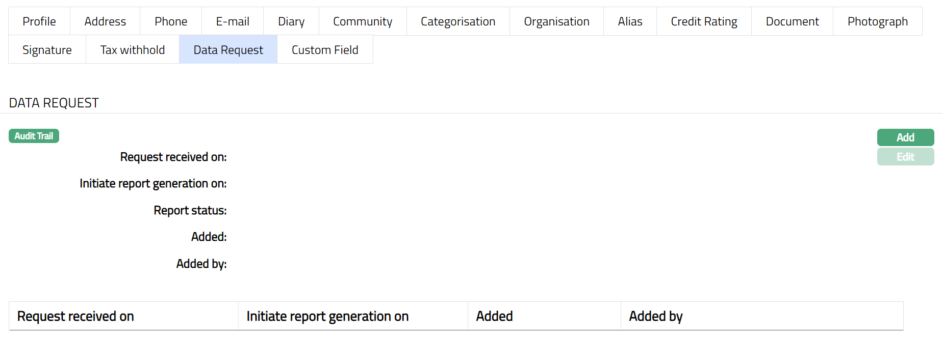 Data Request tab allows you to record the details of request for data stored in your systems (say, under General Data Protection Regulation, i.e., GDPR) when it is raised by a Person. You can mention the Data request date and the Report generation date based on the request of the related person.