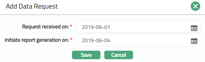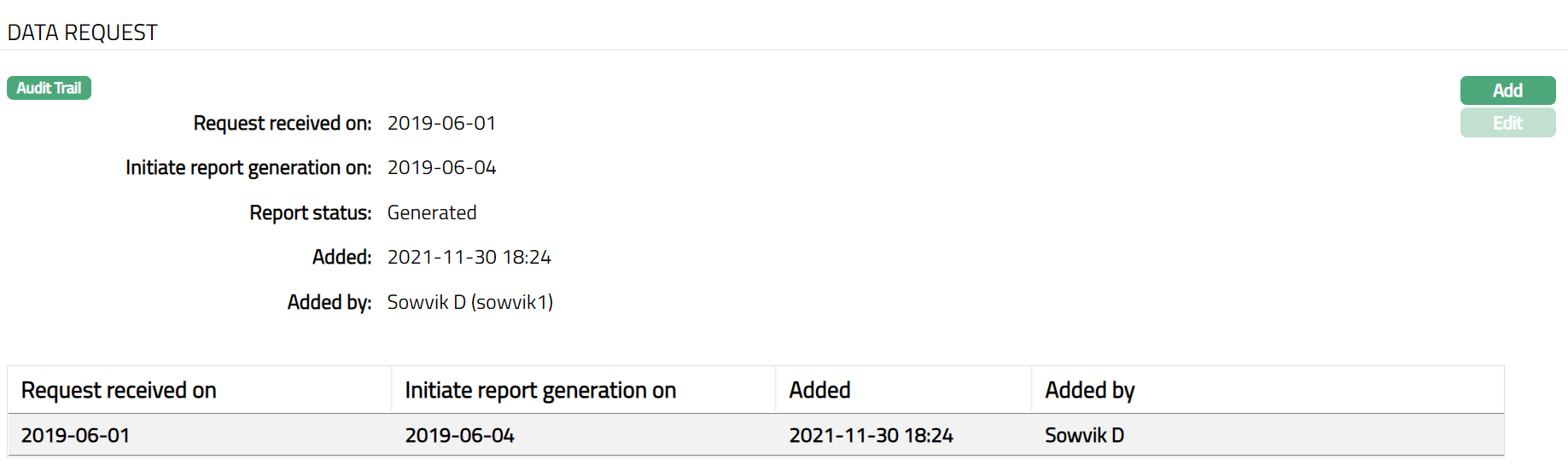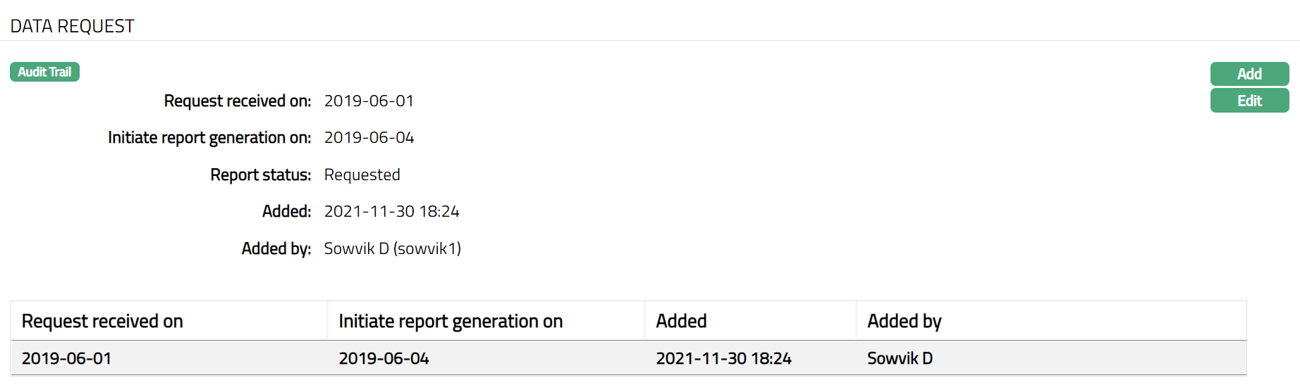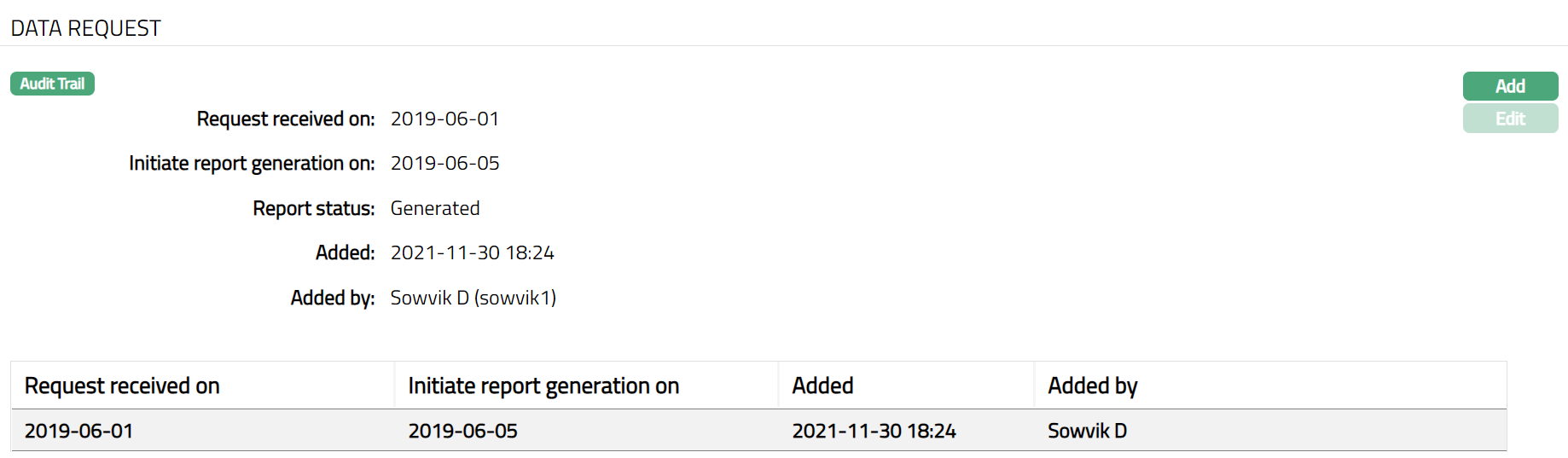 Do the required change and click Save. Data Request page appears with the edited details. Note: Once Saved the Report Status changes to Initiated.