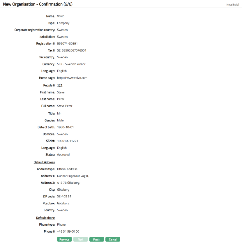 Click Next. New Organisation -- Confirmation (6/6) page appears.