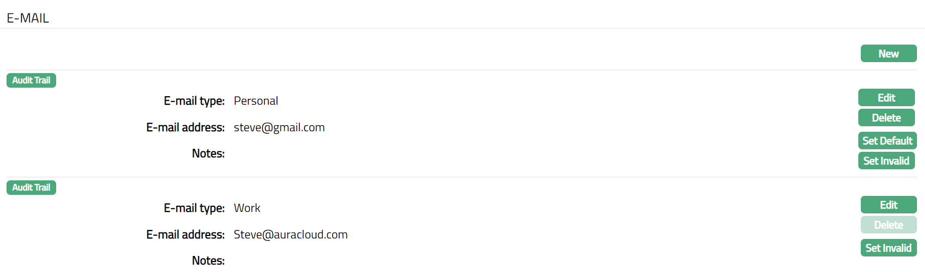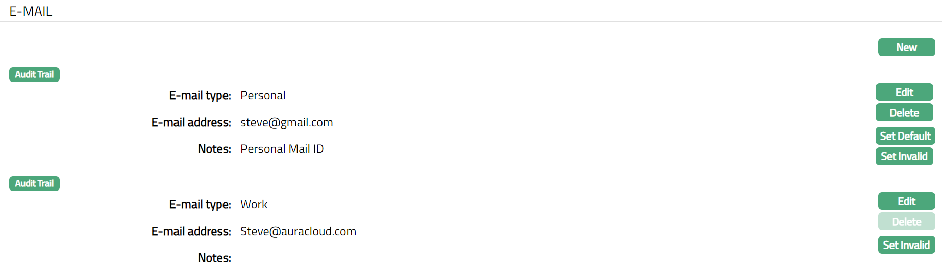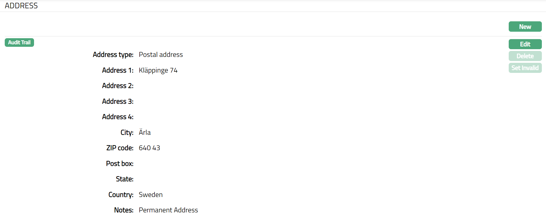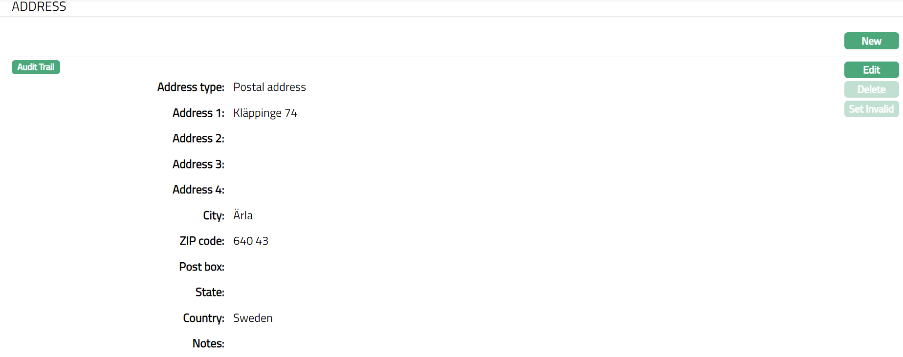 Set Invalid: You can set an Address as invalid by a click on Set Invalid. This means that the particular address record is no longer valid. Aura will ask for confirmation. On confirmation, the Address is made invalid and Set Valid button appear in place of Set Invalid button.