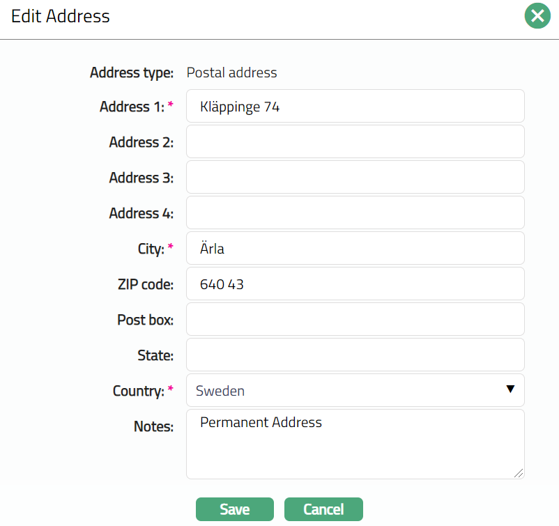 Select Address type from the available drop-down list maintained under Admin > System Codes > Address details > Address types.
