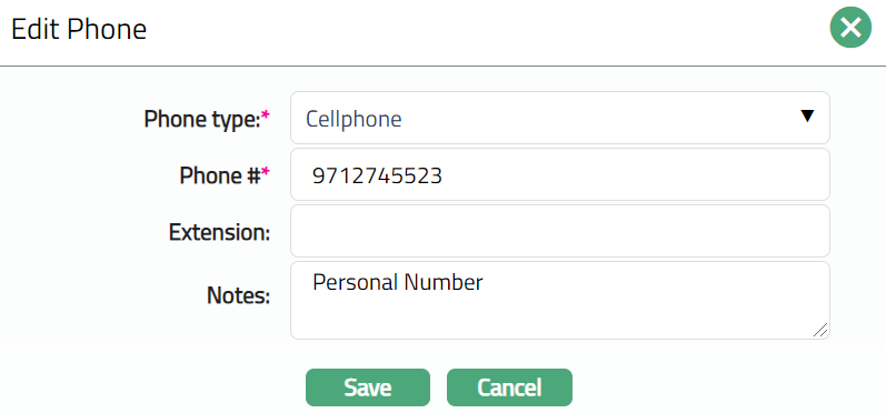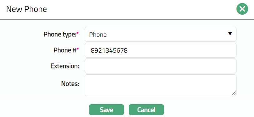 Select Phone type from the available drop-down list maintained under Admin > System Codes > Address details > Phone types.