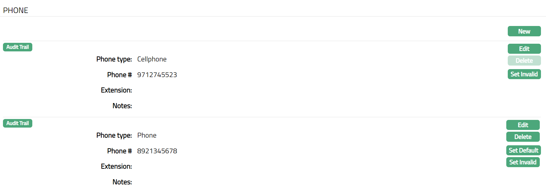 - Access Person page and click Phone tab. Phone details are defaulted from New Person -- Phone (3/5).